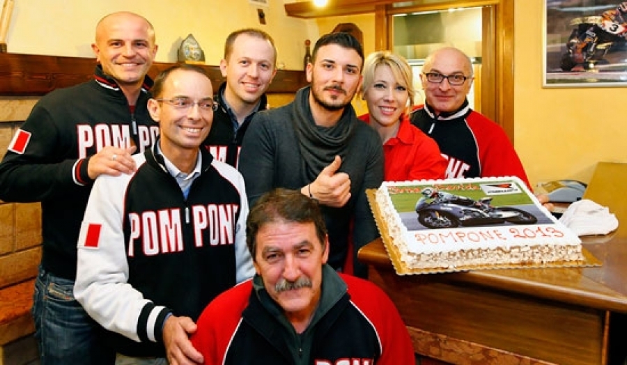 Spunta un messaggio da FB, “chiamami”... allora chiamo e la Rewin annuncia che c’è il pilota in giro per affari e in zona Veneto, ma la conferma per un eventuale incontro sarà l’indomani. Domani vuol dire 2 gg prima della prevista cena, parbleu, qui bisogna attivare PR monster per avvisare quelli giusti per l’evento. Milioni di contatti virtuali vengono spediti nell’universo, per il resto telefono bollente, forum in allarme e passaparola carbonaro a manetta. Il risultato è 40 commensali pronti al Motoristorante per applaudire Davide. Il meeting è amichevole, il personaggio gentile e disponibile, autografi su tutto, foto senza limiti, poi all’arrivo della torta con immagine ufficiale c’era pure un vinello passito per digerire in velocità. Belli tosti i Pomponi iniziano a fare qualche domandina piccante, nelle quali è coinvolta anche la Claudia, graziosa morosa del pilota. Si respira aria di festa, che bello chiacchierare con il personaggio a ruota libera, senza pressioni di gara o di sponsor. Un grande arrivederci prima della fuga, tutti sperano che la strepitosa Aprilia V4 possa regalargli qualche bel risultato. Il tempo è volato, ci piacciono troppo questi bei momenti, avanti il prossimo!