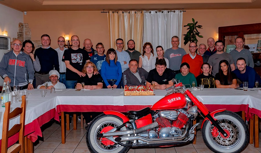 Analizzando le varie proposte, quella al TOP era originale, con spaghetti arrotolati al centro e almeno 8 spicchi con differenti gusti, il nome rimarrà un segreto... I partecipanti erano lo zoccolo duro del club, l’incontro era uno dei tanti che mantengono in vita il gruppo. Il finale, la torta, la fotona di gruppo opera di Carlo “il baffo” e poi mentre ci salutavamo, Michele il boss della pizza, accendeva la sua bobber per riportarla nella posizione originale all’ingresso del locale, quasi 50 metri di distanza, scena di vero mototurismo che chiudeva con un sorriso quella bella serata.