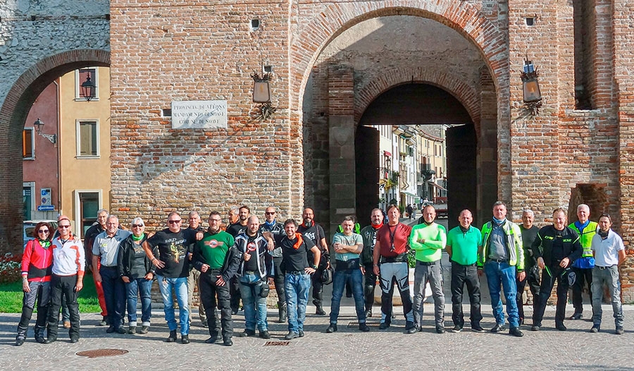 La Lessinia interessa a molti, a Soave ci troviamo con 26 moto e 28 persone, parcheggio davanti a una porta storica e poi si parte. L’itinerario è proposto da Massimiliano Miti, coadiuvato da Alessandro e Nico. La nostra guida sfoggia un mostro Aprilia a 4 cilindri, ma è costretta a usarne solo 2 per farci gustare l’itinerario a gas semichiuso! Primi panorami vigneti, alcuni stesi dalle bombe d’acqua di giorni fa, curviamo felici per un po’ di km, che posti... in montagna c’è ancora l’alpeggio e le malghe sono ancora operative, in moto si sentono questi odori naturali di stalla e fieno, anche l’aria sembra più pura. La prima parte del carosello finisce a Bosco Chiesanuova per l’aperitivo all’albergo ristorante “Casa Leon d’Oro” e poi altri km panoramici scendendo verso Verona e poi superstrada per arrivare veloci alla cantina. Non dovevamo dirlo, ma visto che eravamo in ritardo, ci siamo pure persi, la guida aveva un segnale del navigatore per Genova….